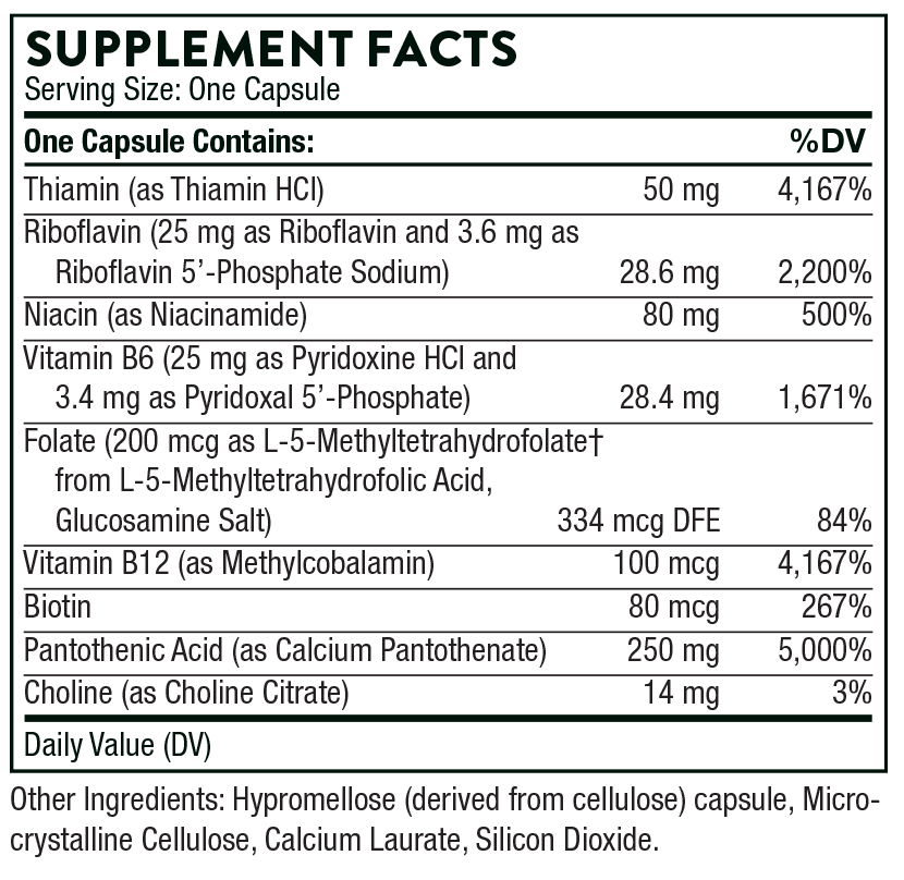 - A complete complex of B vitamins with extra B5 for adrenal support and stress management*