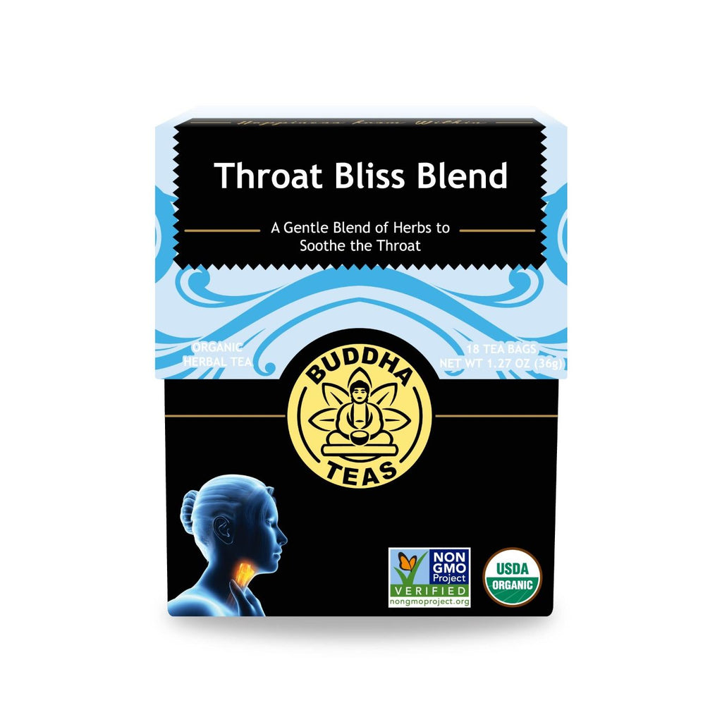 Buddha Teas’ Throat Bliss features marshmallow leaf, an herb that soothes mucous membranes. Combined with throat calming herbs like licorice root, fennel seed, wild cherry bark, and slippery elm, this tea is a necessity for your tea arsenal.*