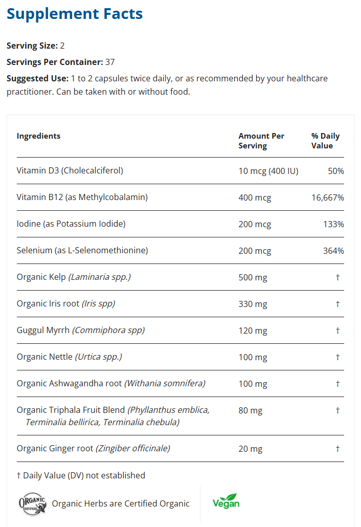 Herb and mineral blend to maintain a healthy thyroid. Contains lower iodine dosage than Thyroid Px.*