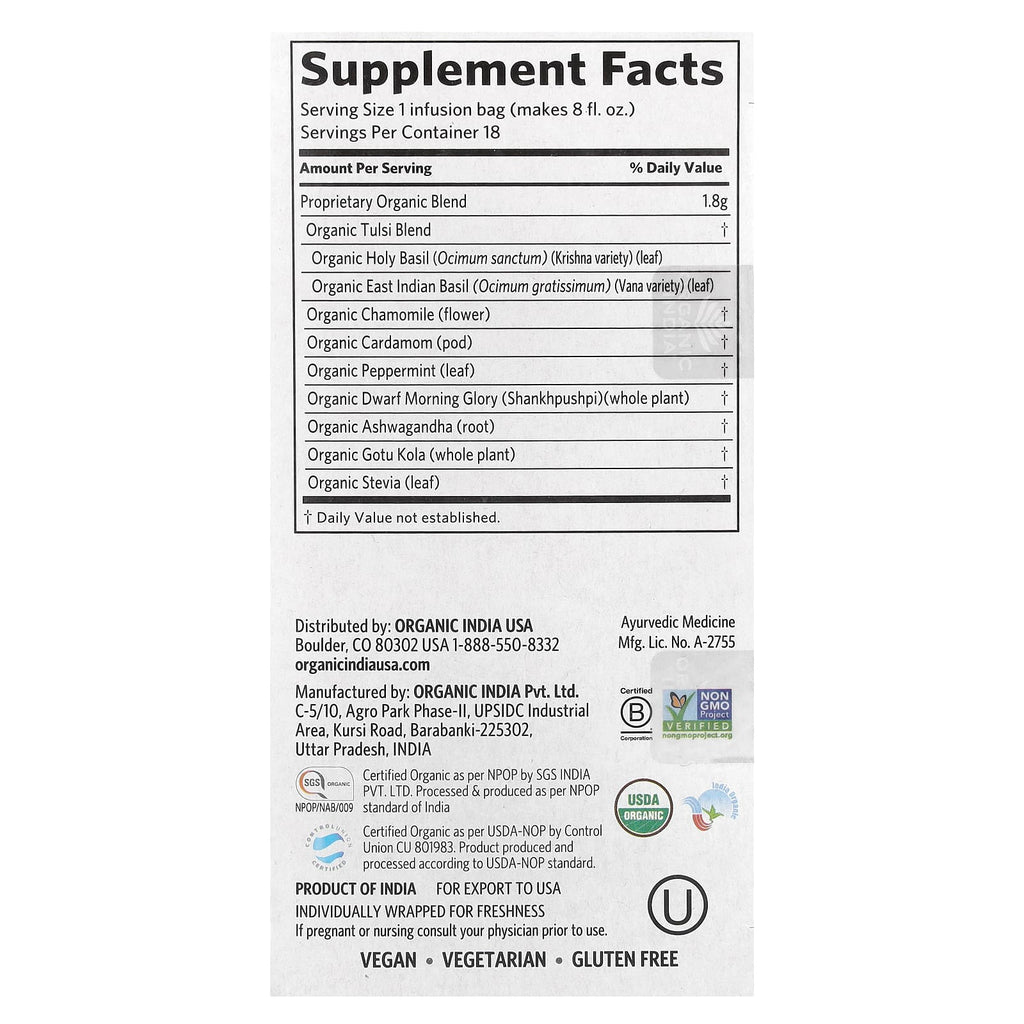 ORGANIC INDIA's foundational herb, Tulsi (Holy Basil) is combined with soothing Ashwagandha to support restful sleep. Tulsi, India's beloved Queen of Herbs for 5,000 years, is a wonderful adaptogen that supports a healthy stress response and Immune System, and Ayurvedic Ashwaghanda is a fantastic restoring and calming herb.*