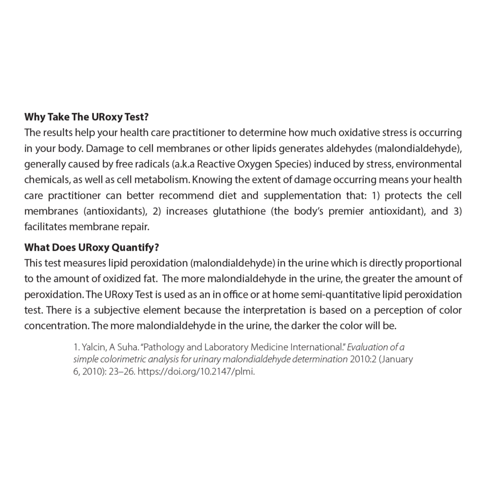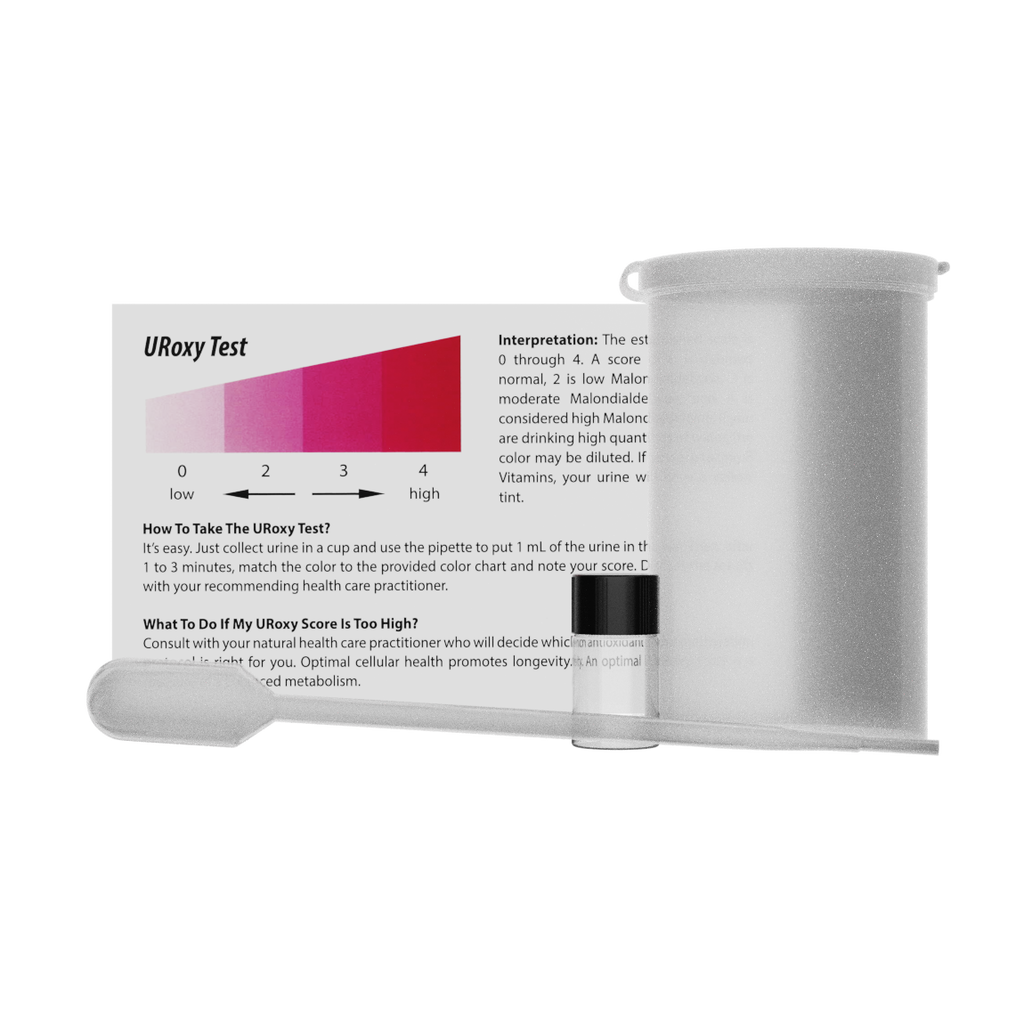 The UR-Oxy test kit by Alimentum Labs assesses cellular health through urinary malondialdehyde levels, offering insights into inflammation levels, oxidative stress levels, and cellular vitality. The results enable personalized antioxidant and detoxification recommendations to achieve robust cellular health and sustained longevity.