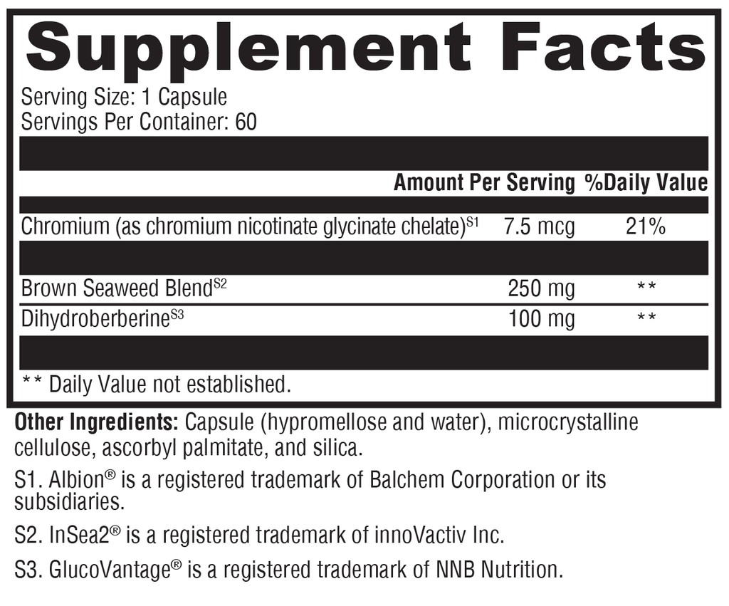 Berberine ES-5 Duo features dihydroberberine (DHB), a highly bioavailable metabolite of berberine with demonstrated benefits for blood glucose metabolism, and InSea2®, a blend of polyphenols derived from sustainably harvested, wildcrafted brown seaweed shown to support a healthy glycemic response to food.*