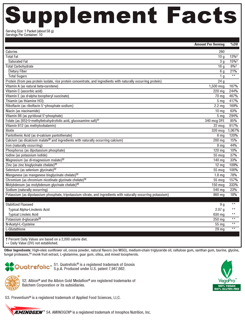 OptiCleanse® Plus is a comprehensive nutritional formula that provides high-quality macro- and micronutrients associated with biological detoxification pathways. The formulation features 24 grams of VegaPro™, a proprietary vegan pea/rice protein; Aminogen® enzyme blend to facilitate protein absorption; activated B vitamins like 5-MTHF and Albion’s patented mineral amino acid chelates for optimal nutrient bioavailability; and milled golden flaxseed that provides a source of omega-3 fatty acids and lignans, which may support estrogen modulation in postmenopausal women. When paired with a modified elimination diet, this formula nourishes the body’s detoxification systems and fuels sustained energy production. This monk fruit–sweetened formula boasts a superior taste without added sucrose, fructose, or stevia and is suitable for vegans.*