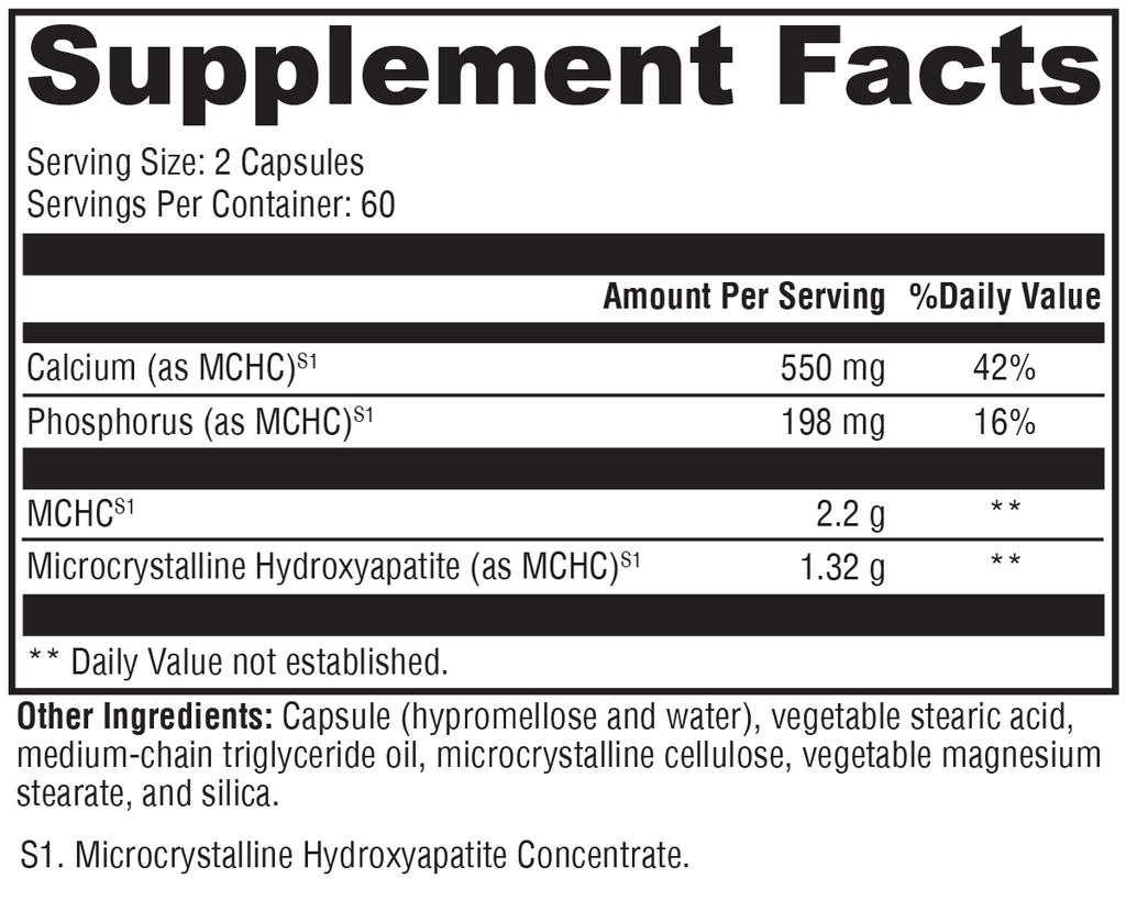 Ossopan 1100™ delivers 1100 mg of standardized microcrystalline hydroxyapatite concentrate (MCHC) per capsule. MCHC is a scientifically researched natural complex that contains the building blocks of healthy bone, including calcium, phosphorus, bioactive IGF growth factors, type I collagen, amino acids, glycosaminoglycans, and essential trace elements. Derived from one of the safest sources of premium bovine bone in the world, free-range New Zealand cattle, the MCHC, in this formula, provides comprehensive bone nourishment to support bone strength and structure.*