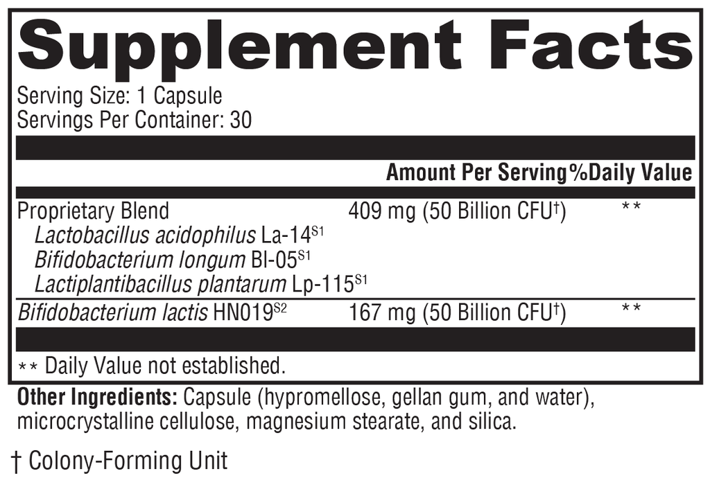 ProbioMax® Daily 100B is a vegetarian, dairy- and gluten-free, 4-strain probiotic totaling 100 billion CFU† per serving. Each capsule is sealed in nitrogen-purged aluminum blister packs to protect from heat, moisture, and oxygen, factors proven to compromise the stability of probiotics. This formula provides 4 researched strains of beneficial bacteria, including HN019®, an extensively studied strain of Bifidobacterium lactis. These live microorganisms have proven health benefits, well-established safety, and have been tested for epithelial cell adhesion and/or resistance to low pH.*