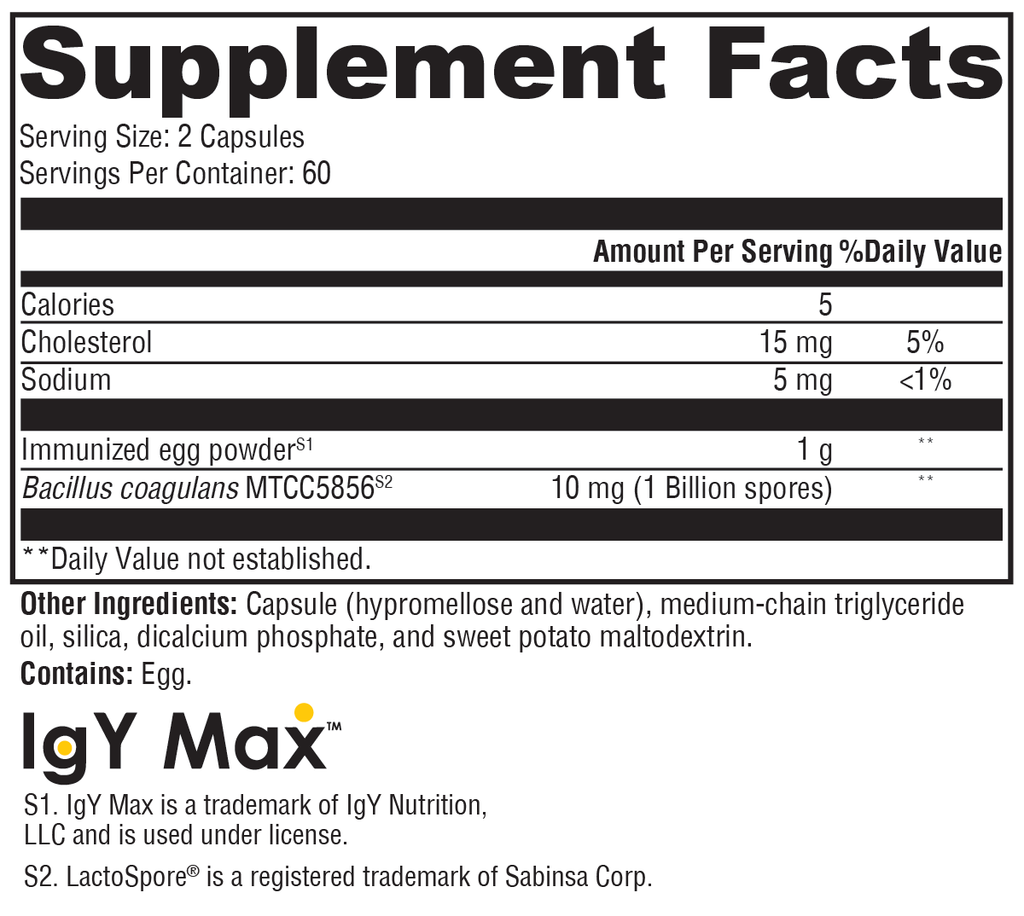 ProbioMax® IG 26 combines patented ingredients IgY Max® and LactoSpore®. LactoSpore is Bacillus coagulans MTCC5856, a stable L(+) lactic acid–producing, spore-forming probiotic with roles in promoting microbiome balance and maintaining blood lipid levels already within a healthy range. IgY Max is an immunized egg powder, providing polyvalent IgY immunoglobulins to fortify intestinal barrier protection, promote gastrointestinal and immune system health, and support microbiome, mycobiome, and cytokine balance.*