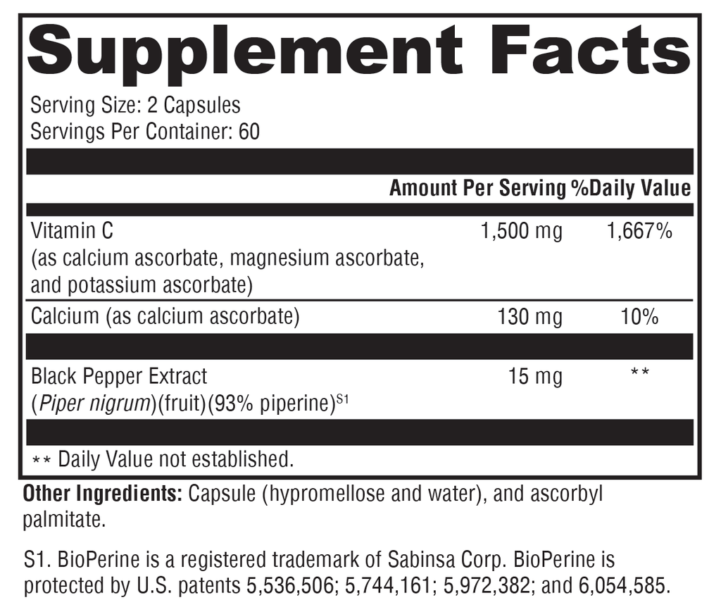 Xcellent C™ is a high-potency vitamin C formula with the addition of 7.5 mg of BioPerine® per capsule. BioPerine, a proprietary black pepper extract, is present to promote absorption and bioavailability of vitamin C. Vitamin C provides valuable antioxidant protection and is necessary for the production of collagen, an integral component of blood vessels, tendons, ligaments, and bone. This essential water-soluble vitamin is required for the synthesis of neurotransmitters and carnitine as well. Xcellent C contains buffering minerals to help prevent potential stomach upset.*